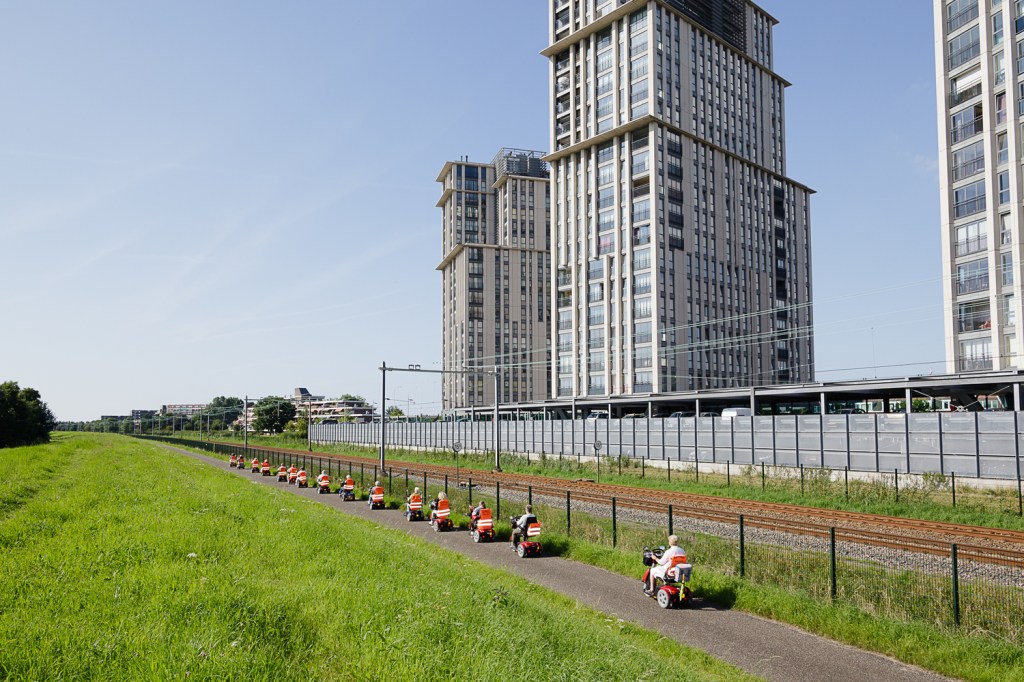 Wat verder opvalt op deze foto: alle deelnemers hebben een zichtbaar oranje hesje over de leuning van hun scootmobiel, behalve de achterste dame in het wit. Zij rijdt op een afstandje van de groep en er lijkt een rugzak over haar hesje te hangen. Je zou zeggen dat juist als laatste in de rij de zichtbaarheid van het hesje essentieel zou zijn. Maar misschien zit hier een scootmobiellogica achter die ik nog niet ken.