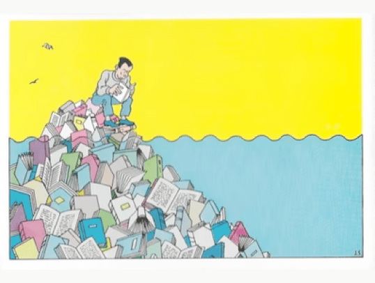 De man, zittend op een ijsschots van boeken, leest driftig door. Doet hij dat om te zorgen dat hij niet verdrinkt? Zo lijkt het wel, we weten alleen niet of het water stijgt en hij daarom moet doorlezen, maar: boeken, zo suggereert het, die moet je lezen om niet ten onder te gaan. Het is onwaarschijnlijk dat Swarte het zo stichtelijk heeft bedoeld. In al zijn werk ligt het ludieke er dik bovenop. Je kunt ook denken: als dit is wat je moet doen om te overleven, láát dan maar. Dan nog liever met twee betonnen schoenen de zee in. Een dikke middelvinger naar het boek.